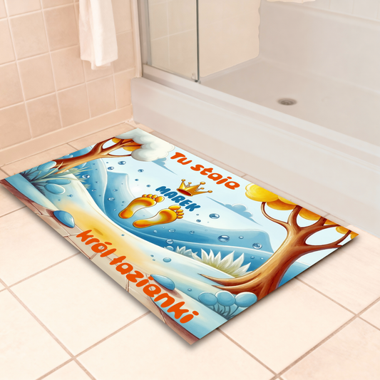 Personalizowany dywanik łazienkowy „Tu staje król łazienki” z imieniem - mata z zabawnymi stopami, idealna dla dzieci