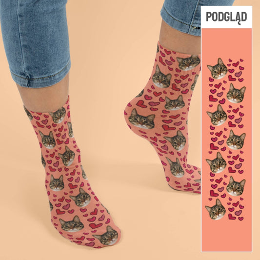 Skarpetki Personalizowane – Kot i Serduszka Twój Zdjęciowy Akcent