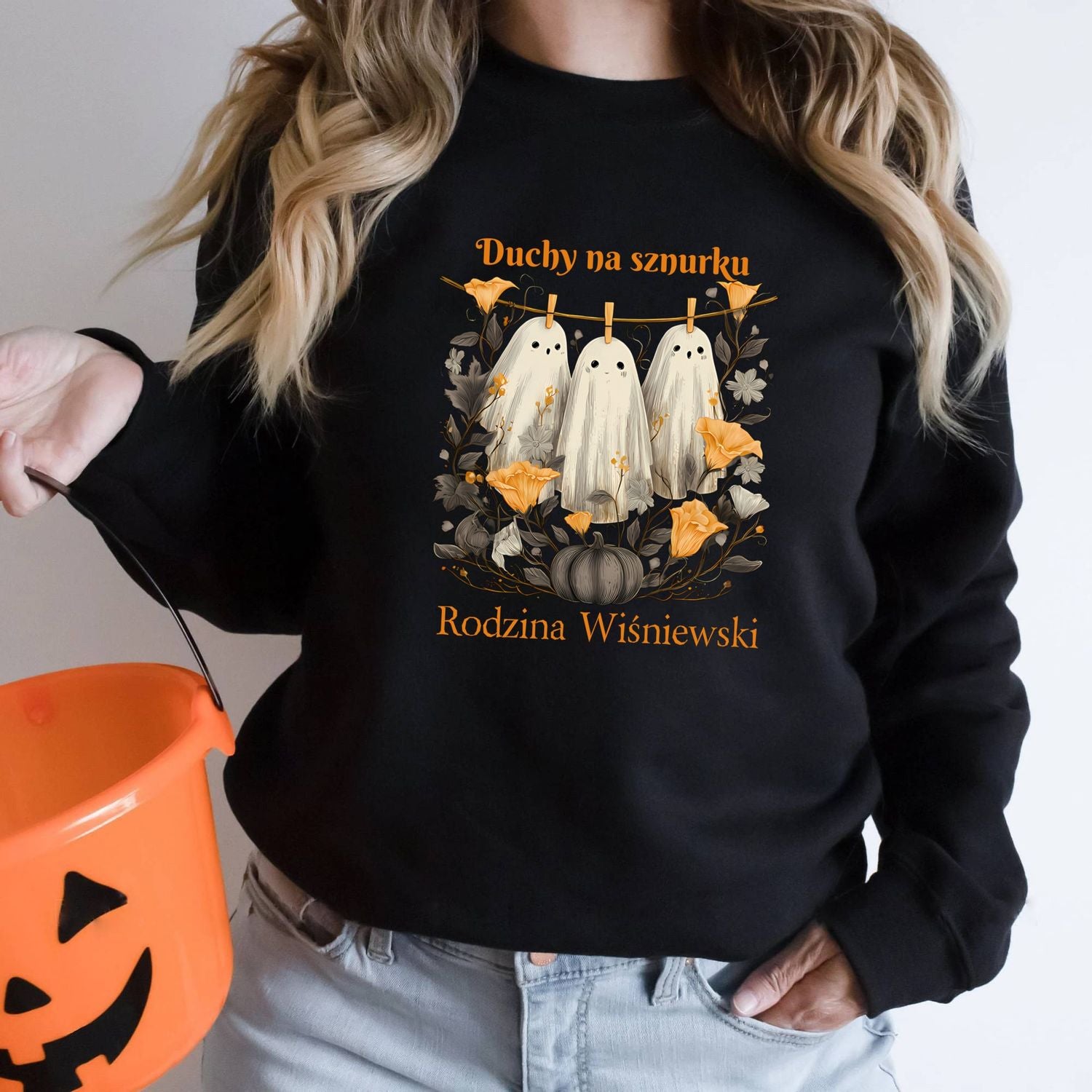 Ciepła, przytulna i pełna uroku – bluza „Duchy na sznurku” to wyjątkowy projekt z serii Halloween Boo Collection 🎃👻. Urocze duchy suszące się na sznurku w otoczeniu jesiennych liści i dyni symbolizują rodzinne ciepło, humor i magię jesieni. Bluza pozwala dodać nazwisko, by stworzyć spersonalizowany prezent dla całej rodziny – idealny na chłodne wieczory i wspólne zdjęcia z kubkiem kakao.