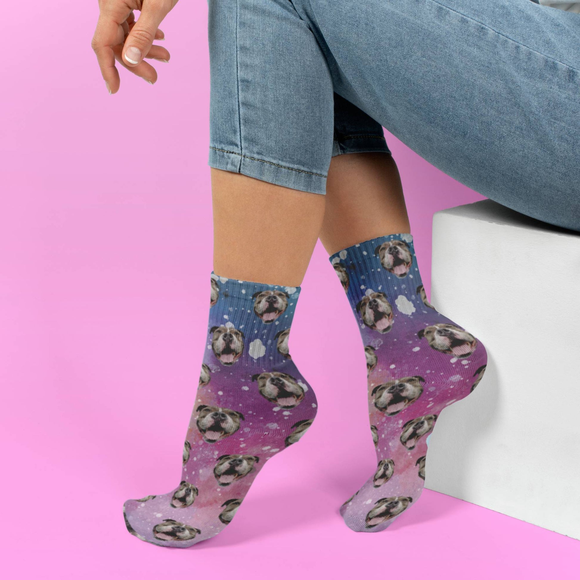 Dodaj swojemu stylowi nieziemskiego charakteru! 🌌 Te spersonalizowane skarpetki z Twoją twarzą w kosmicznym tle to idealny sposób, by wyróżnić się na co dzień i podkreślić swój unikalny charakter. Wystarczy przesłać zdjęcie, a nadruk pojawi się na całej powierzchni skarpetek w towarzystwie gwiazd, chmur kosmicznych i kolorowych odcieni fioletu oraz błękitu.