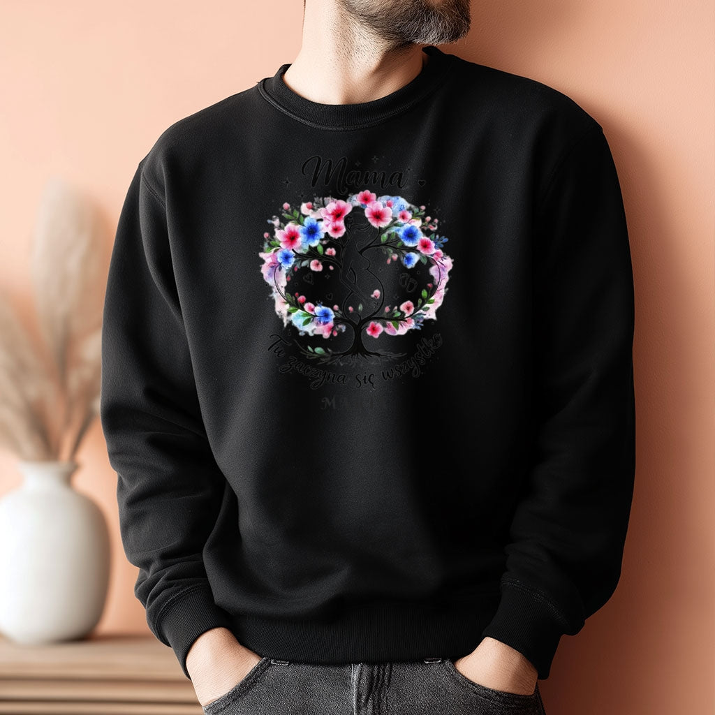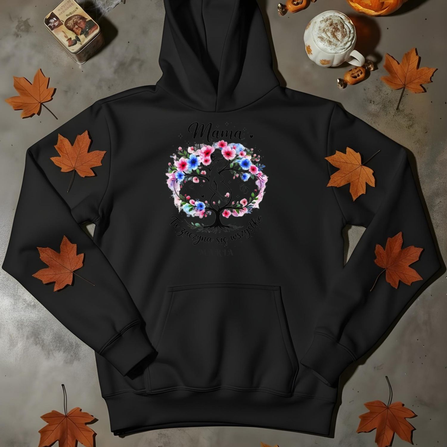 Centralnym elementem grafiki jest delikatna ilustracja drzewa życia w kwiatowym wieńcu, symbolizująca nowe życie, miłość i początek czegoś niezwykłego. Pod grafiką umieszczamy imię (np. Maria), dzięki czemu koszulka staje się osobistą pamiątką z okresu ciąży.