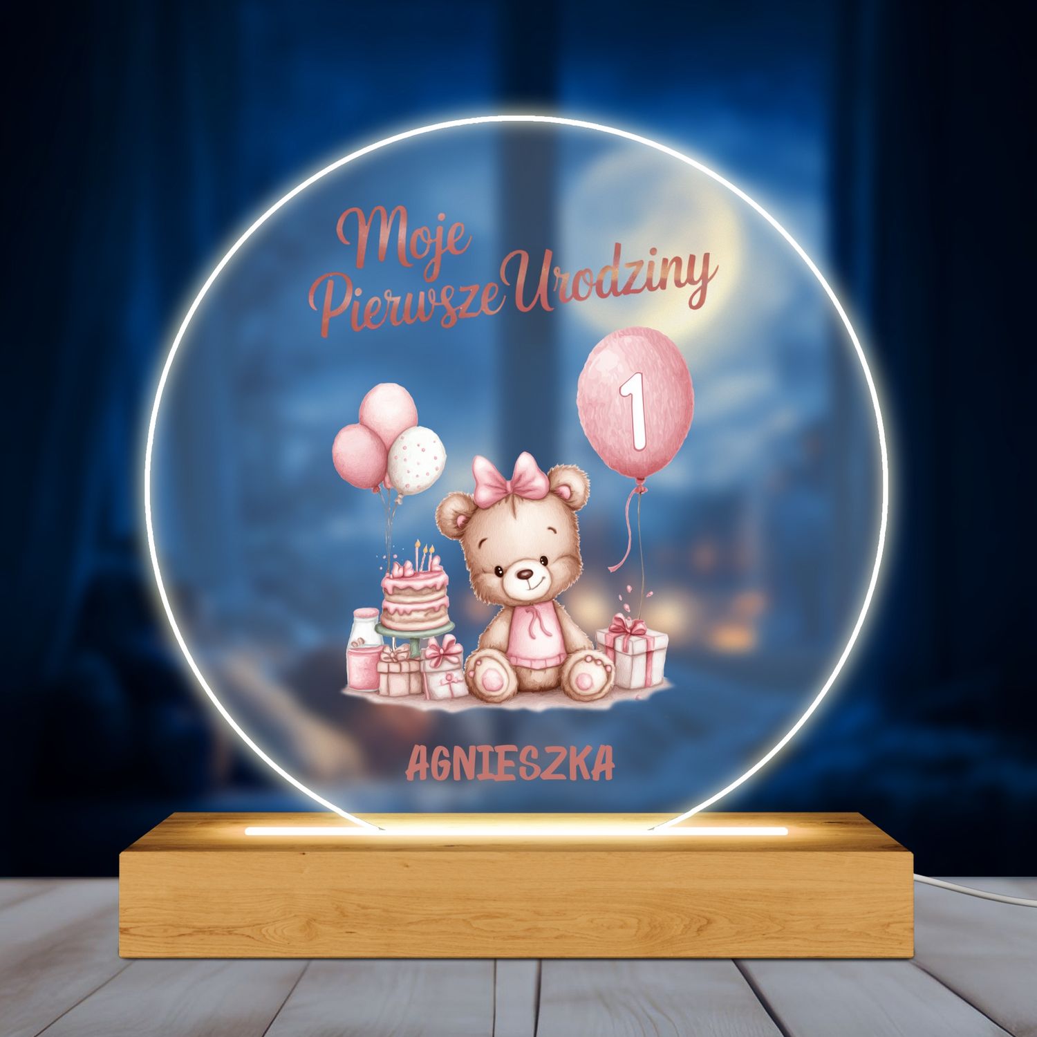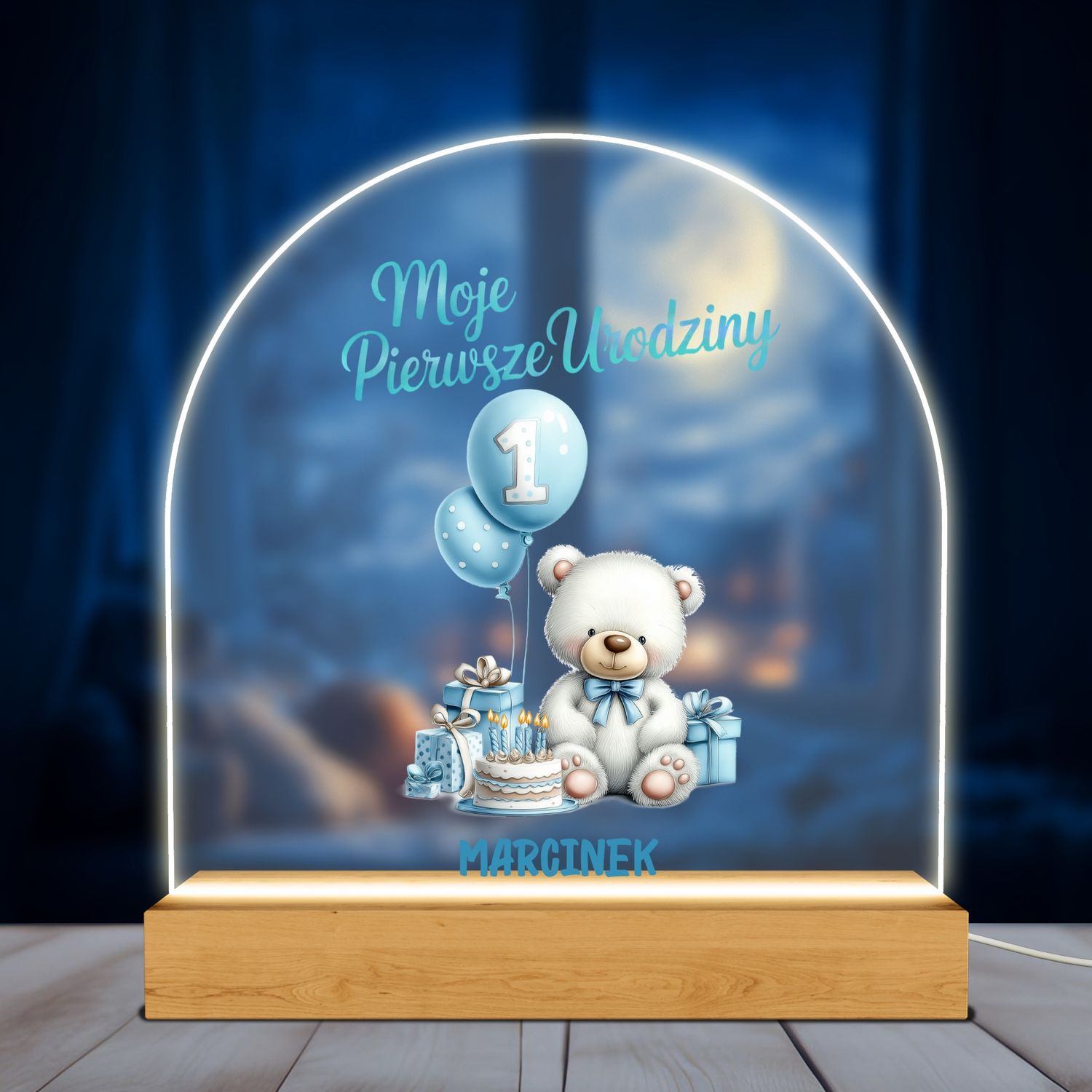Personalizowana lampka LED „Moje Pierwsze Urodziny” z uroczym misiem, balonikiem i tortem to idealny prezent na wyjątkowy dzień w życiu maluszka. Delikatne podświetlenie i możliwość dodania imienia dziecka (np. Marcinek) sprawiają, że to nie tylko dekoracja, ale także piękna pamiątka na lata. Wykonana z przejrzystego akrylu i drewnianej podstawy LED – gotowa do wręczenia jako prezent!