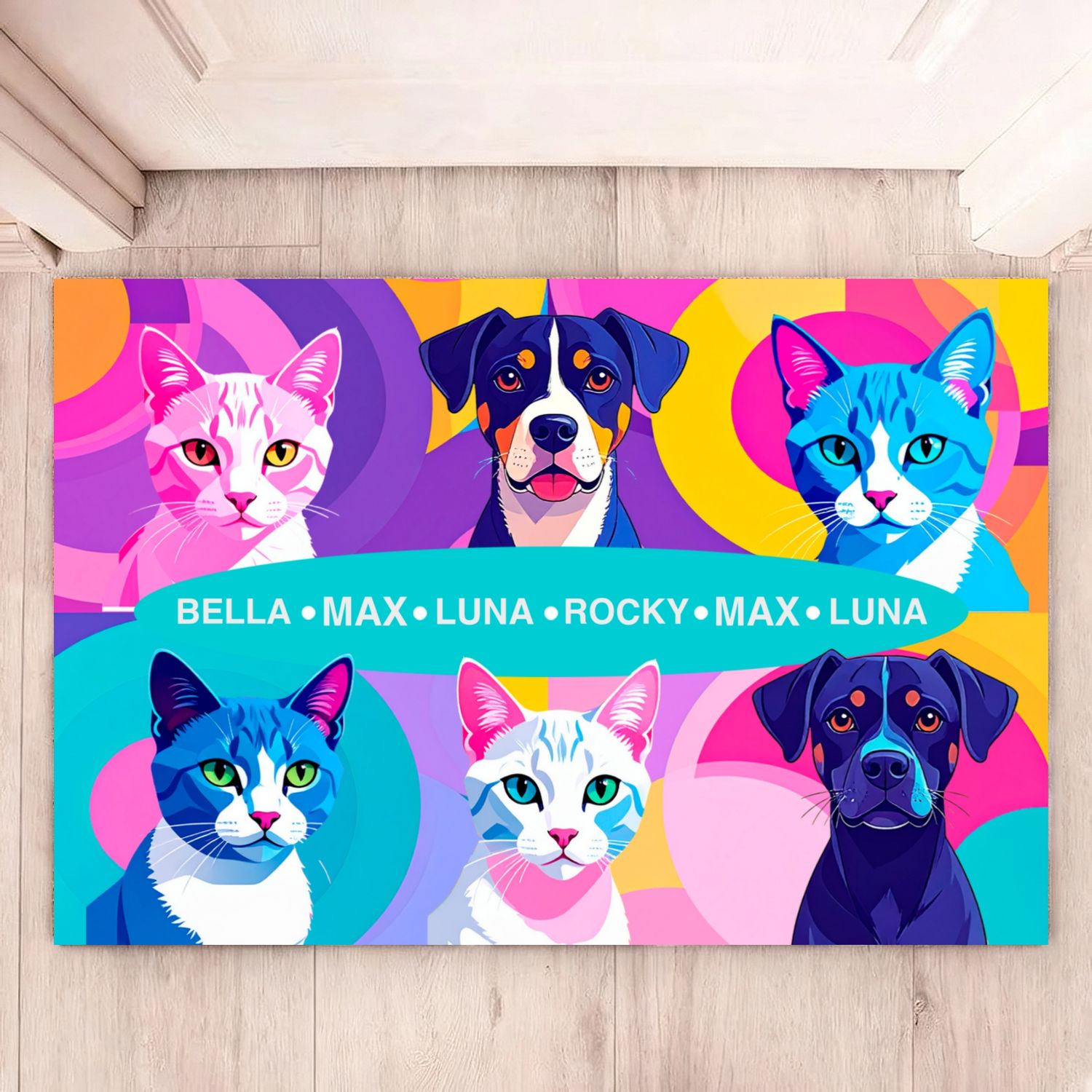 Ta personalizowana mata dla pupila w stylu pop-art to idealny dodatek do Twojego domu. Zabawna, energetyczna i w pełni unikalna – z imionami Twoich kotów lub psów. Każdy projekt tworzony jest indywidualnie, aby oddać charakter Twoich futrzastych przyjaciół.