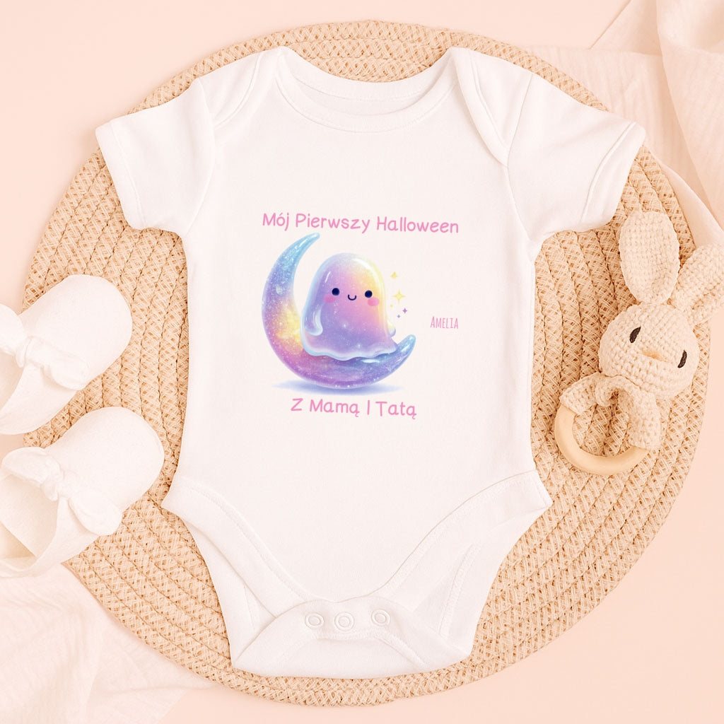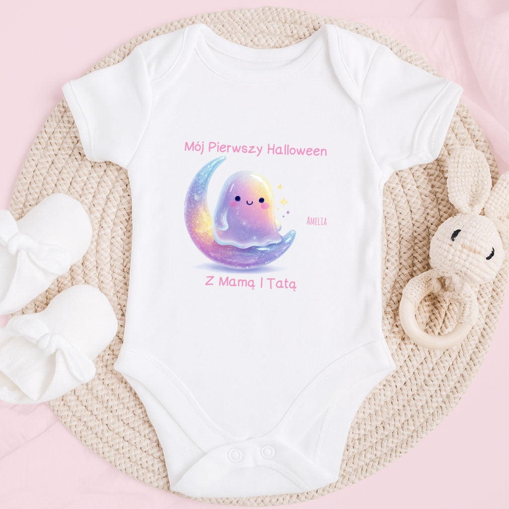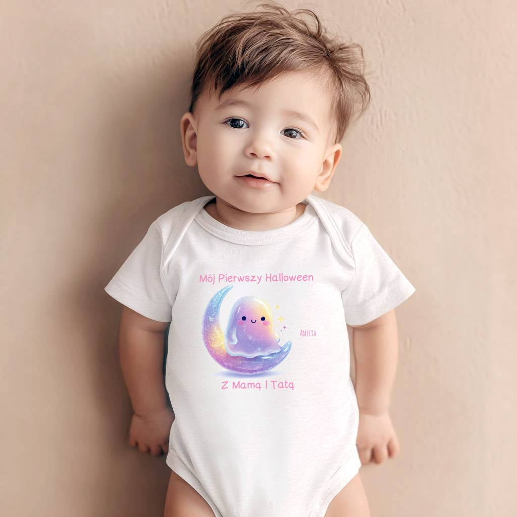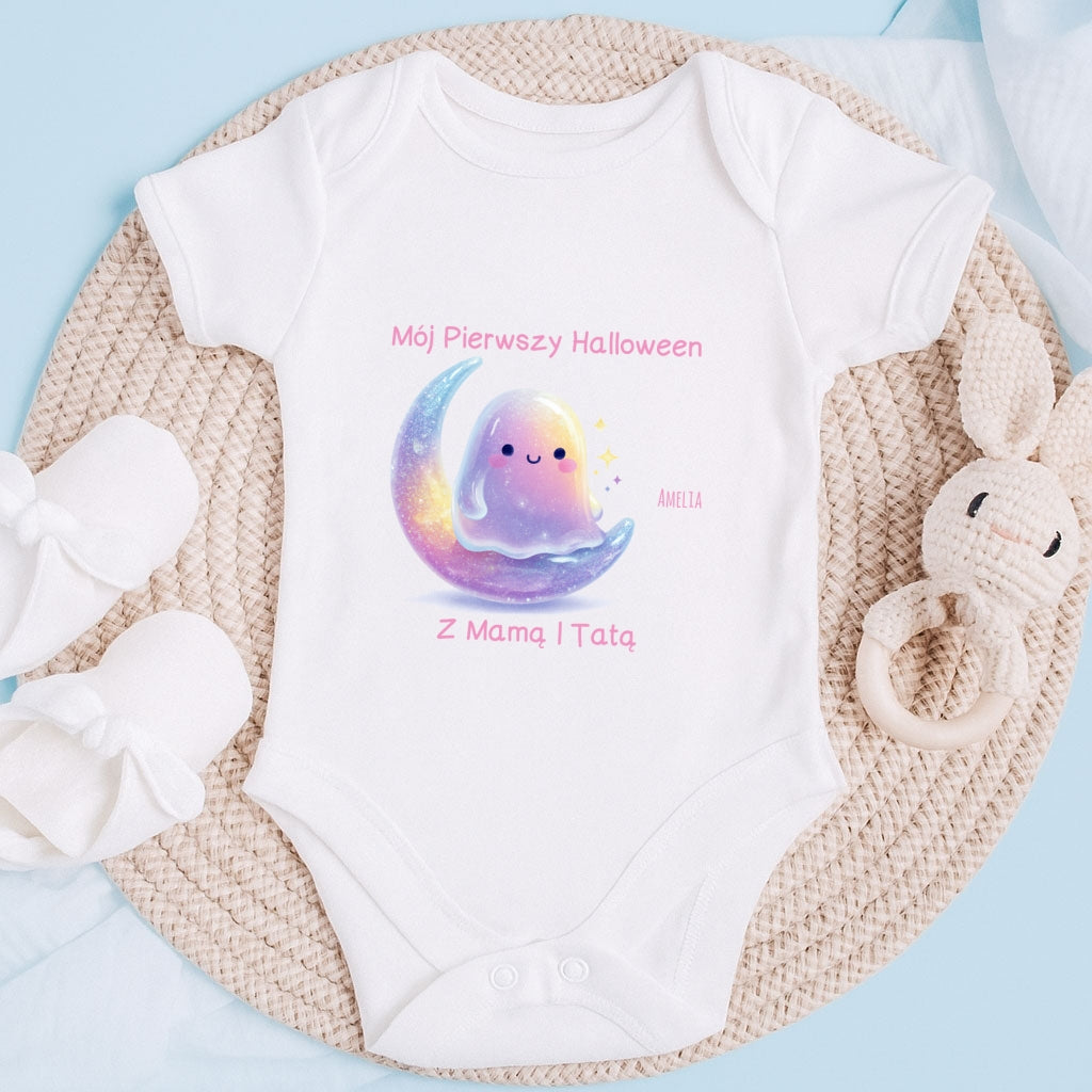 Nasze body z uroczym motywem dyni, duszka, nietoperza i kolorowym napisem „Pierwszy Halloween” to idealny strój na halloweenowe zabawy, sesję zdjęciową lub wizytę u dziadków!