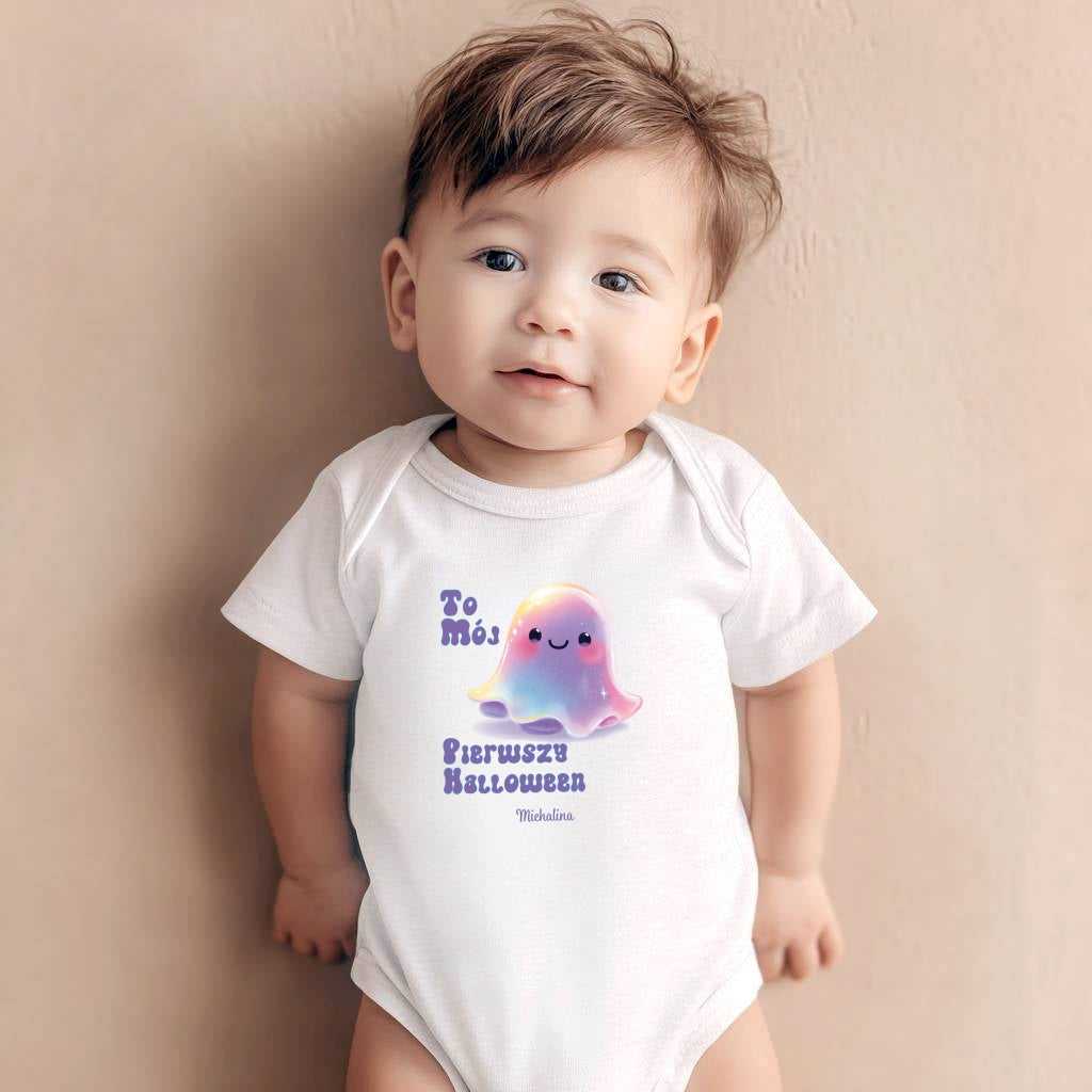 Nasze body z uroczym motywem dyni, duszka, nietoperza i kolorowym napisem „Pierwszy Halloween” to idealny strój na halloweenowe zabawy, sesję zdjęciową lub wizytę u dziadków!