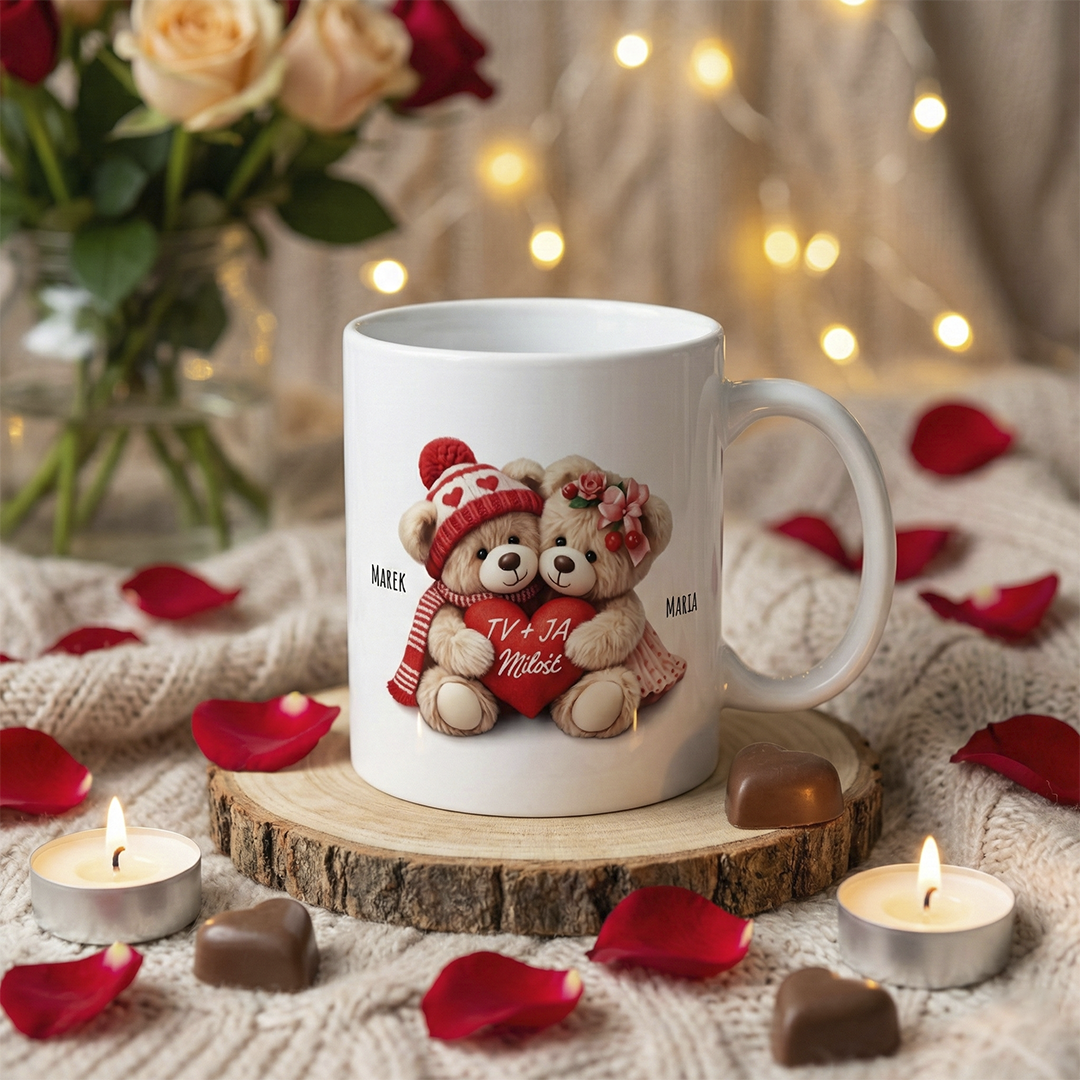 Sercem projektu jest słodka grafika misiów trzymających serce, którą uzupełniamy Waszymi imionami. Dzięki temu kubek staje się Waszym osobistym symbolem czułości – idealnym na zimowe wieczory pod kocem i leniwe, wspólne poranki.