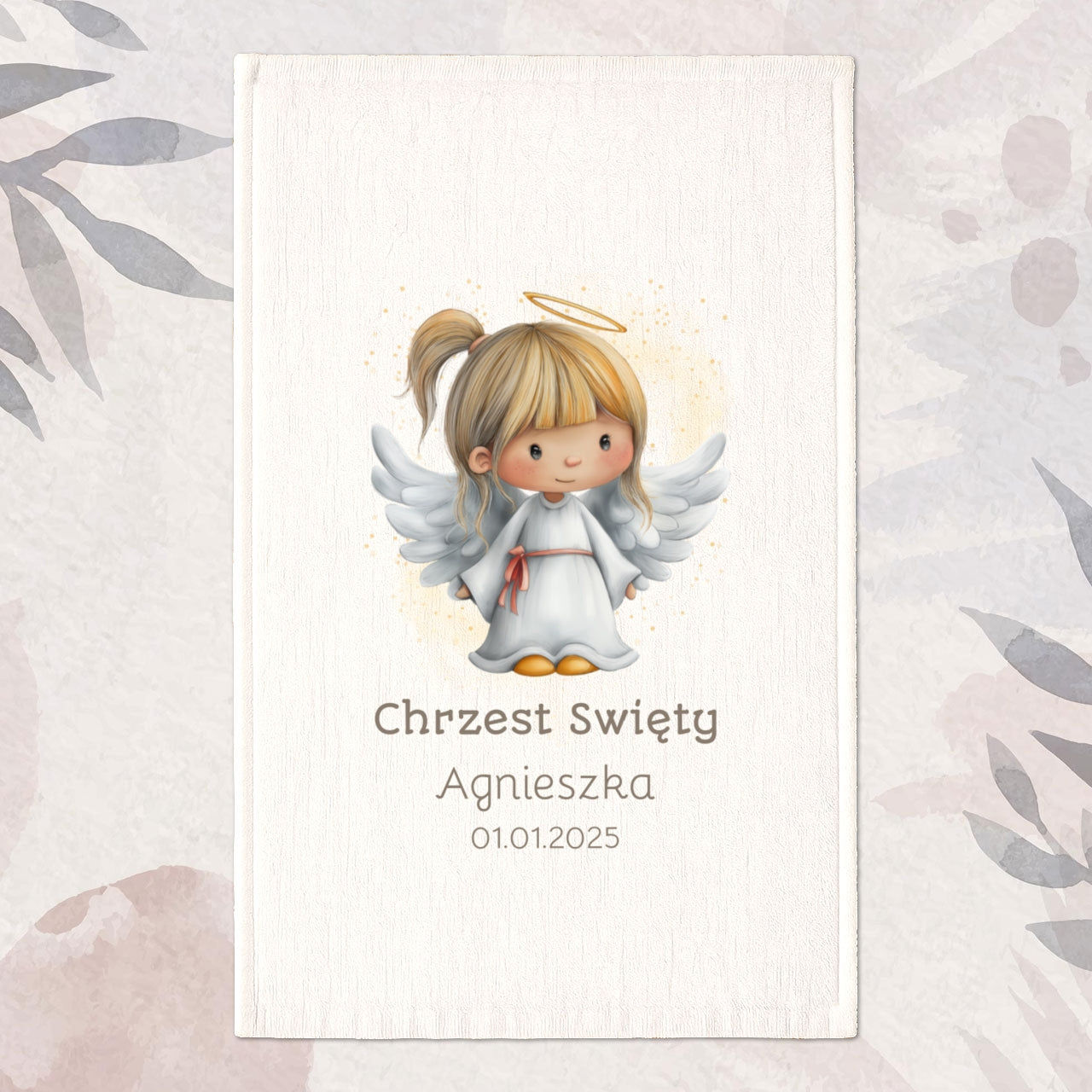 Uczyń Chrzest Święty jeszcze bardziej wyjątkowym dzięki personalizowanemu ręcznikowi z uroczym aniołkiem.
