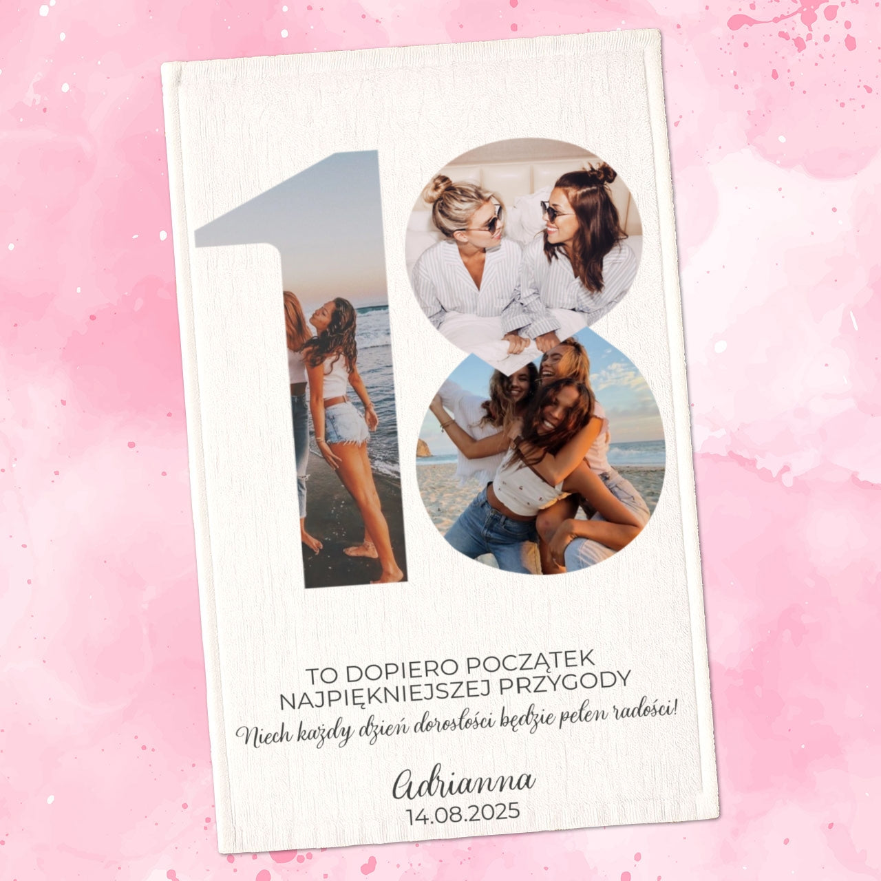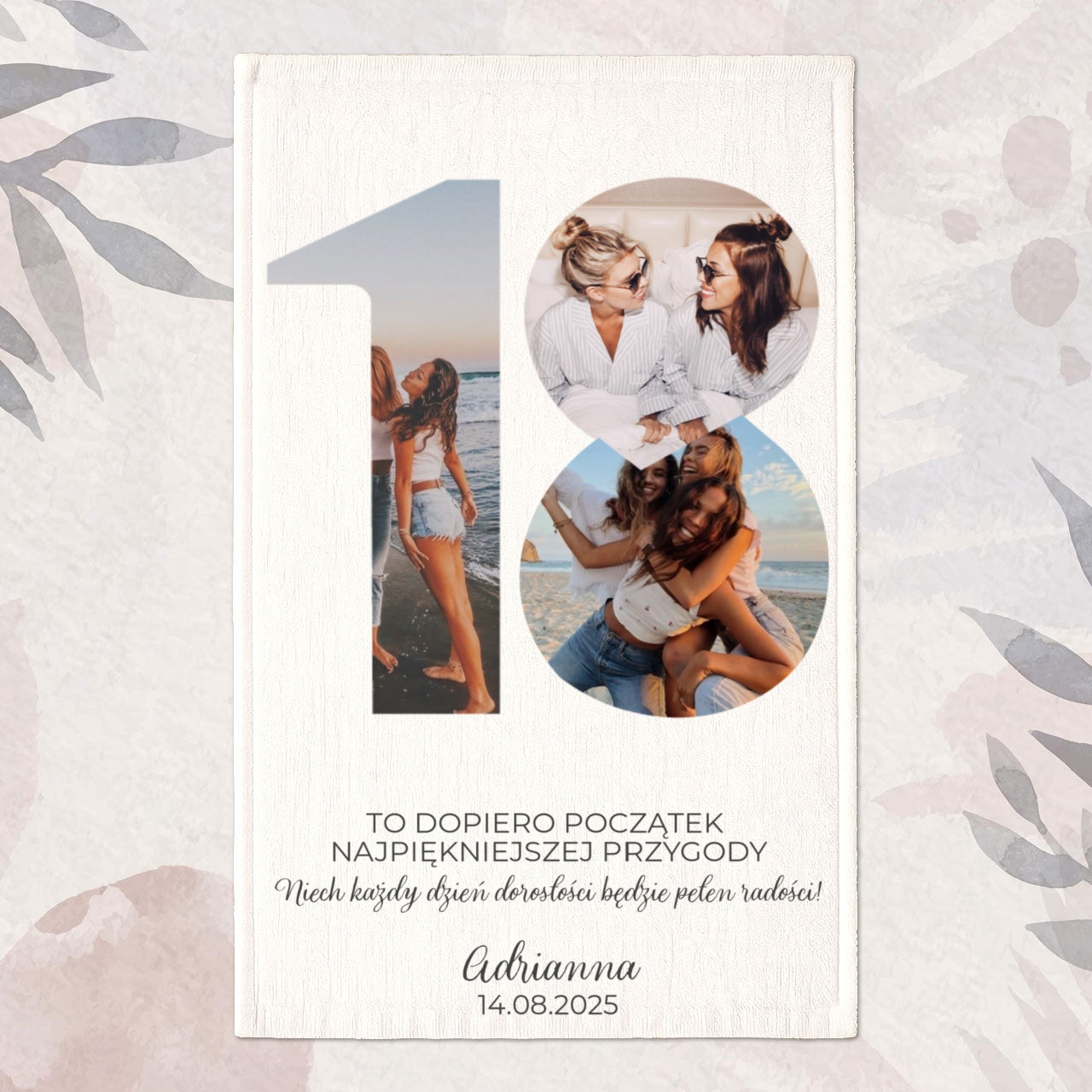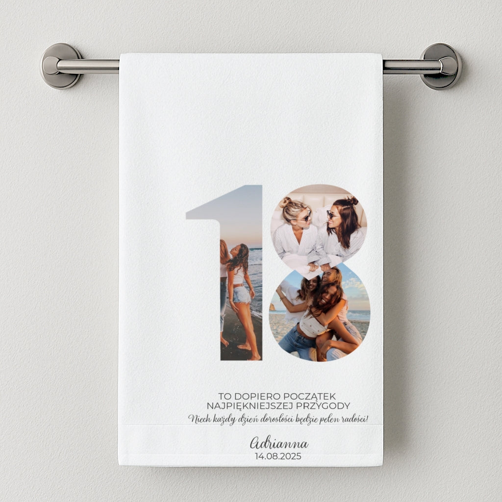 Na powierzchni ręcznika znajduje się duży, efektowny motyw liczby „18”, wypełnionej Twoimi ulubionymi zdjęciami. Możesz dodać imię jubilata, datę oraz dedykację, aby stworzyć unikalną pamiątkę, która będzie towarzyszyć na co dzień i przypominać o tym wyjątkowym dniu.