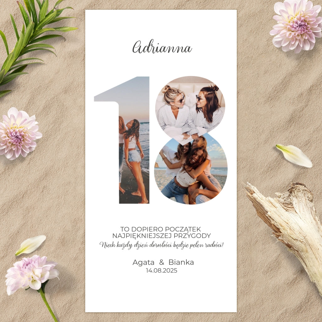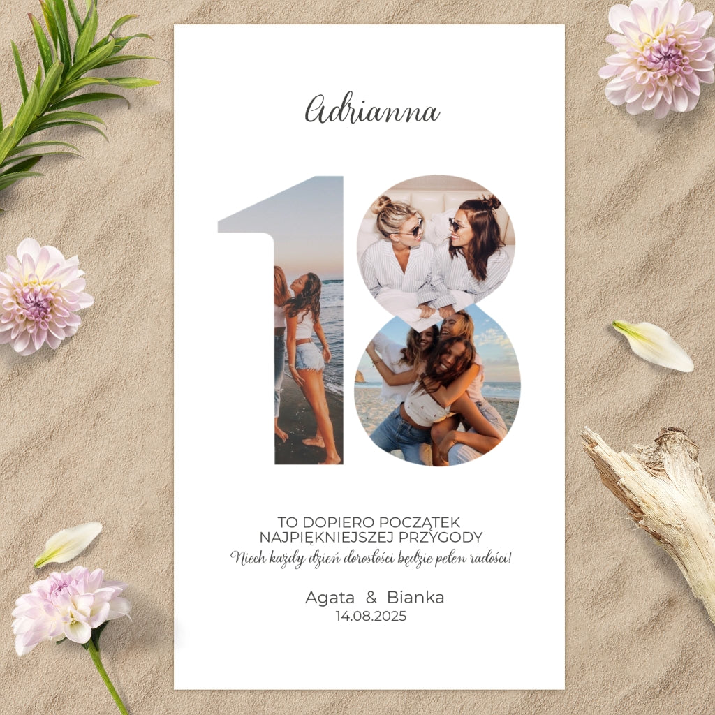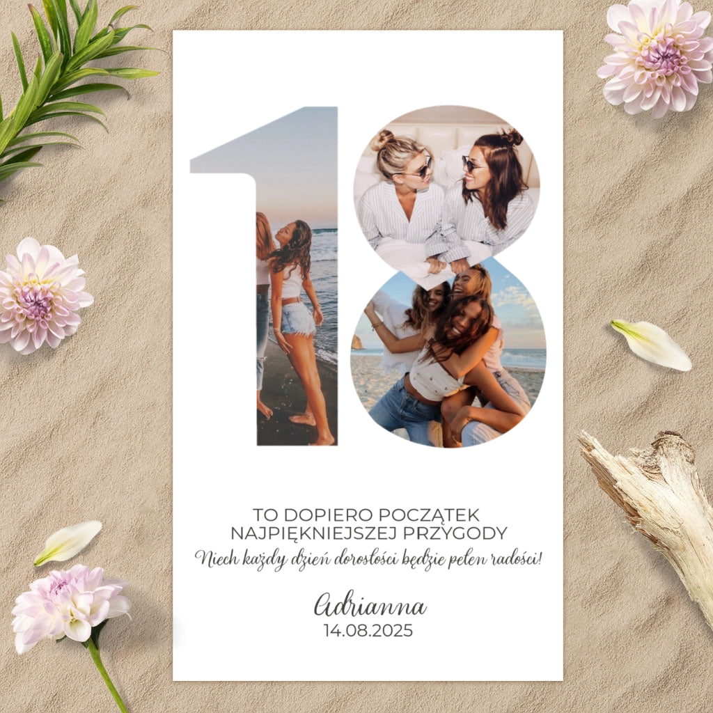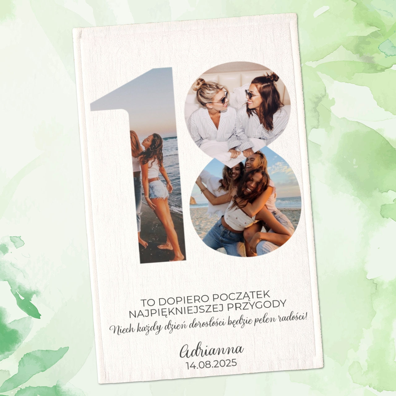 Na powierzchni ręcznika znajduje się duży, efektowny motyw liczby „18”, wypełnionej Twoimi ulubionymi zdjęciami. Możesz dodać imię jubilata, datę oraz dedykację, aby stworzyć unikalną pamiątkę, która będzie towarzyszyć na co dzień i przypominać o tym wyjątkowym dniu.