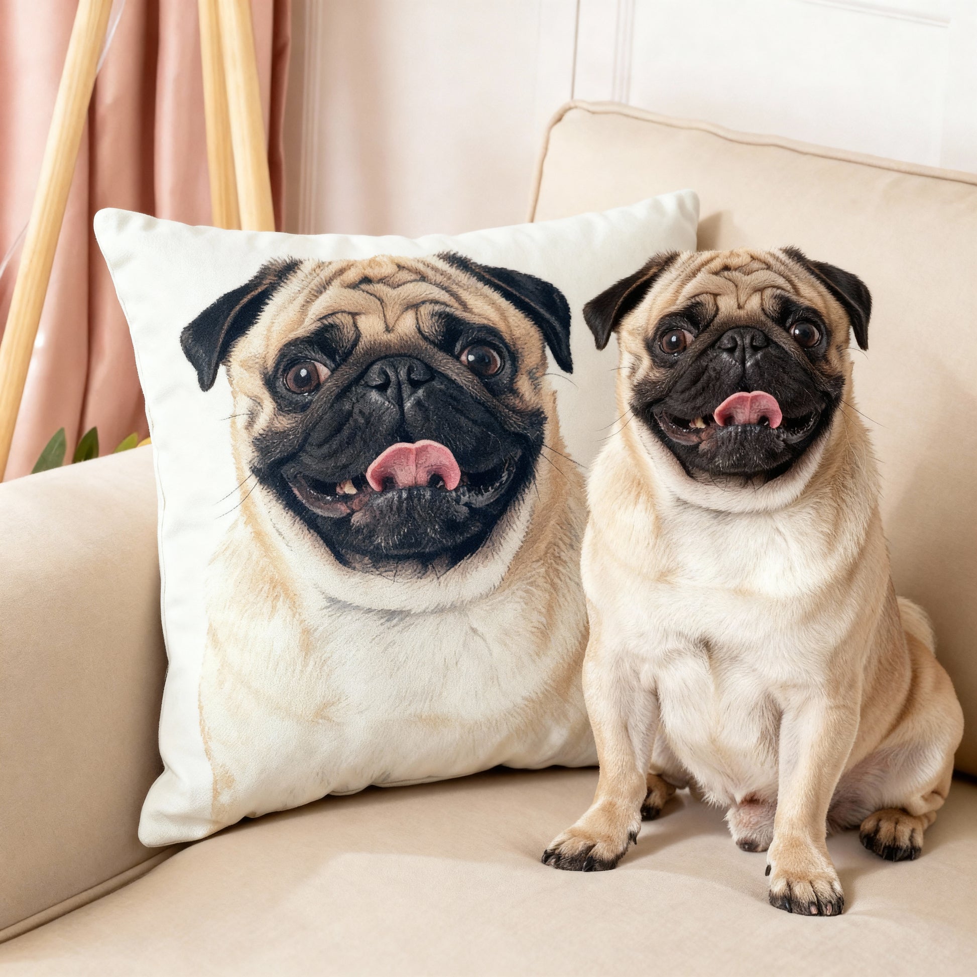 Ta spersonalizowana poduszka z Twoim psem to idealny sposób, by zachować wspomnienia i udekorować wnętrze w ciepły, oryginalny sposób. Wystarczy jedno zdjęcie Twojego zwierzaka — a my stworzymy realistyczny nadruk w jakości fotograficznej.