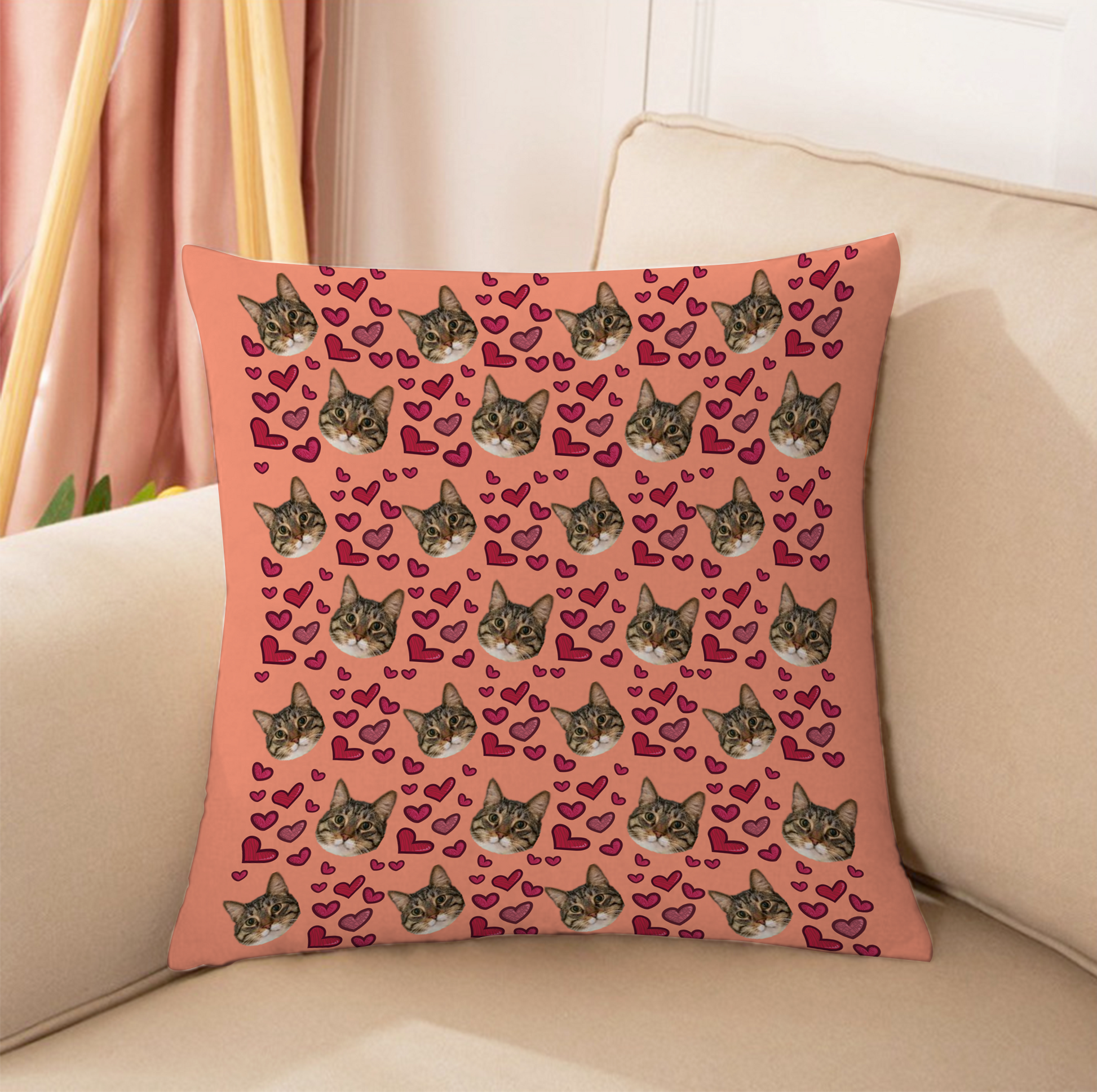 Ta personalizowana poduszka z Twoim zwierzakiem to połączenie uroku i stylu. Wystarczy przesłać zdjęcie Twojego kota lub psa, a my stworzymy oryginalny wzór z jego twarzą, otoczoną serduszkami i ciepłym pastelowym tłem.