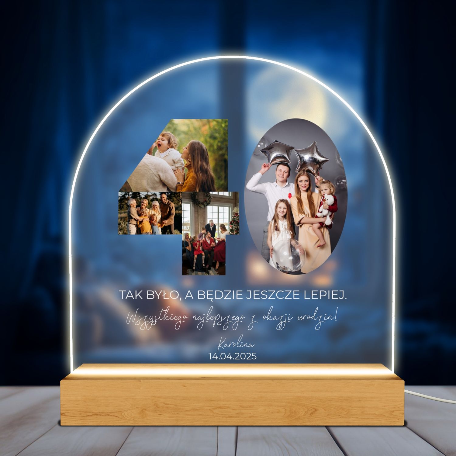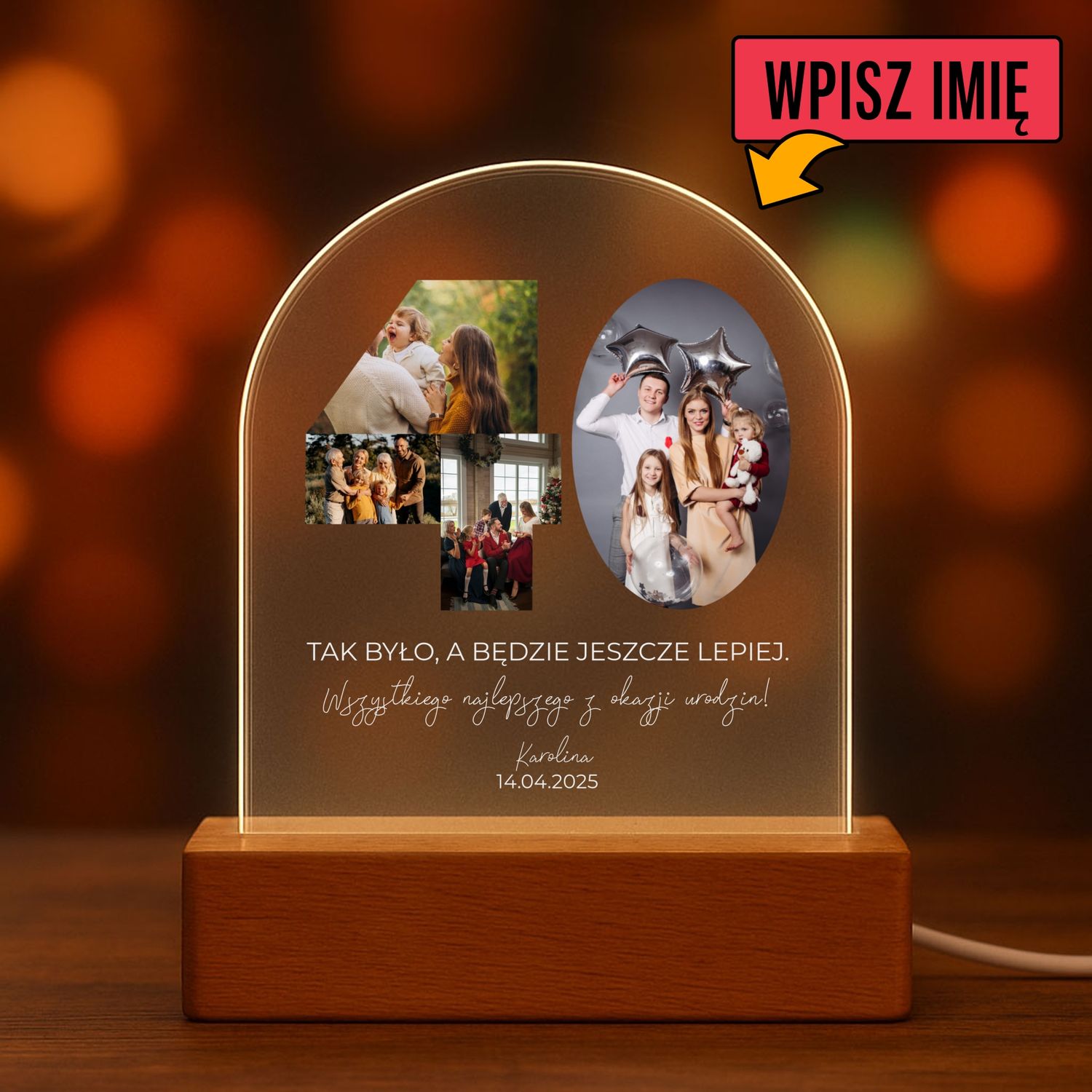 - Personalizacja: 4 zdjęcia + imię + data + dedykacja
