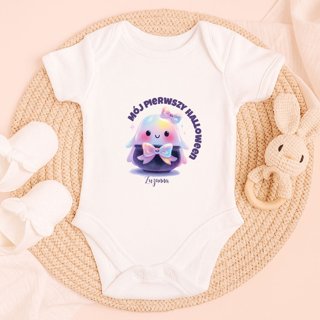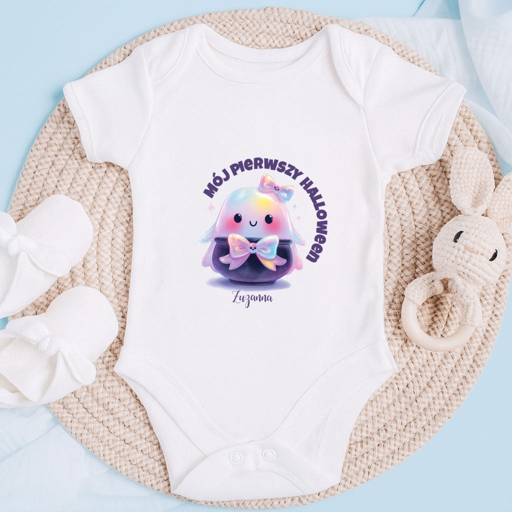Nasze body z uroczym motywem dyni, duszka, nietoperza i kolorowym napisem „Moje pierwsze Halloween” to idealny strój na halloweenowe zabawy, sesję zdjęciową lub wizytę u dziadków!