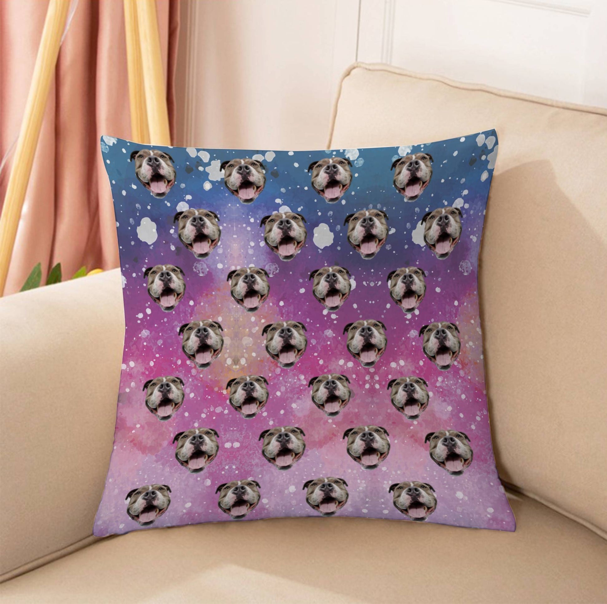 Ta spersonalizowana poduszka z twarzą pupila w kosmicznym stylu to idealny prezent dla każdego miłośnika zwierząt. Wystarczy przesłać zdjęcie swojego psa lub kota, a my stworzymy niepowtarzalny wzór z jego pyszczkiem na tle pełnym gwiazd i pastelowych barw.