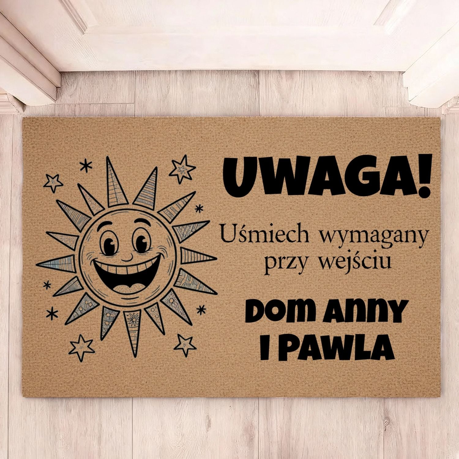Wprowadź radość już od progu dzięki personalizowanej wycieraczce „Uśmiech wymagany przy wejściu”! To nie tylko praktyczny element domu, ale także wyjątkowa dekoracja, która od razu poprawia humor każdemu gościowi. Dzięki możliwości dodania imion domowników, wycieraczka staje się unikalna i w pełni dopasowana do Twojej rodziny.